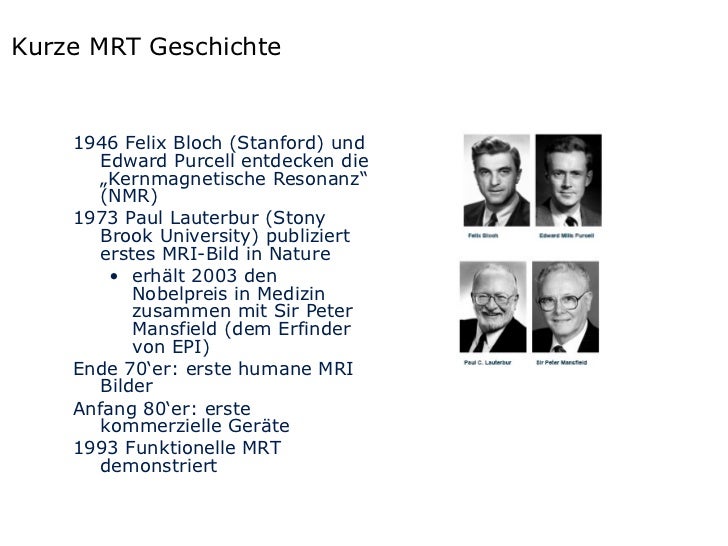 Das technische Prinzip der MRT wurde 1946 von Bloch und Purcell entdeckt und zunächst in der Physik und der Chemie angewendet. Magnetresonanztomographie innovativ und sicher Die Kernspintomographie ist ein eindrucksvolles Beispiel eines innovativen zugleich sehr sicheren und sich rasant weiterentwickelnden Diagnoseverfahrens in der Radiologie. Beide Wissenschaftler erhielten 1952 den Nobelpreis für diese Entdeckung.